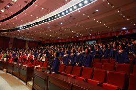 毕业典礼在雄壮的国歌中拉开序幕,全体人员庄严肃立,用深情的歌声诉说着对祖国深沉的爱。