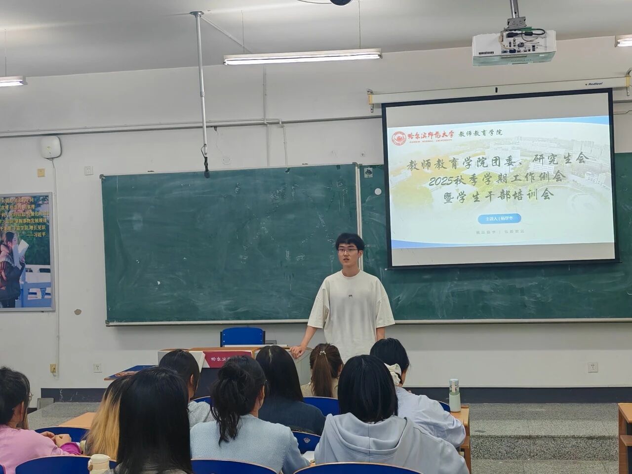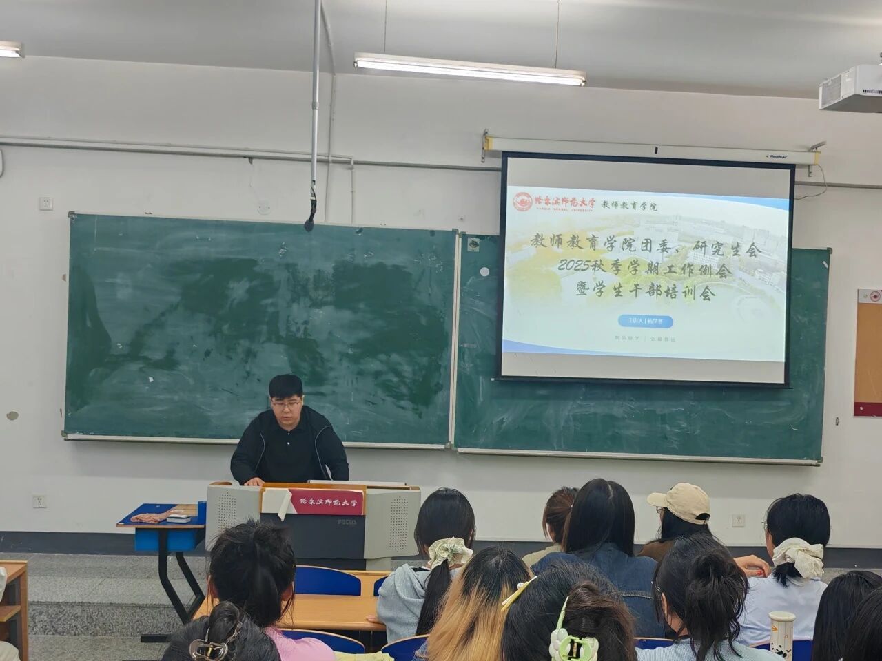 秋意渐浓,征程新启。为明确新学期工作方向,强化学生干部的综合素质与服务能力,2025年9月25日下午,教师教育学院团委、研究生会在崇师楼B522教室召开了2025年秋季学期工作例会暨学生干部培训会。会议由教师教育学院辅导员杨学冬主持,院团委、研究生会全体成员参会。