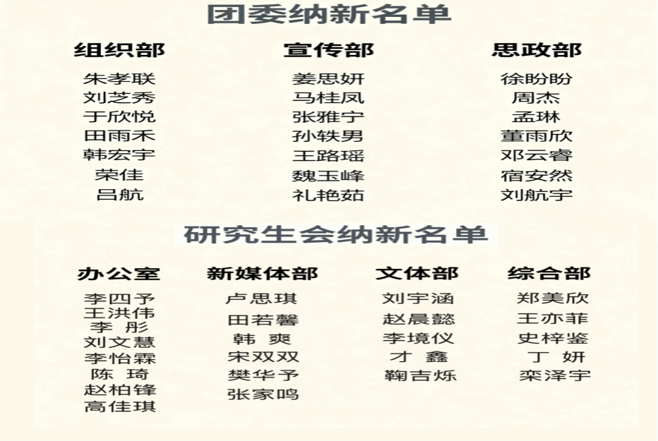 会议进入培训环节。首先,会议公布了2025年秋季学期教师教育学院团委、研究生会纳新名单,共有45名新成员通过选拔加入各部门。纳新名单如下:
