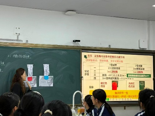 其次,王淑婷老师以“多酶片”为核心情境,巧妙将其说明书作为探究主线,引导学生开展小组讨论,自主设计探究酶的专一性、影响酶活性因素等核心实验。课堂中,师生结合实验视频辅助验证,逐步推导得出实验结论;王老师还适时穿插多次知识拓展,帮助学生拓宽知识边界。课程尾声,王老师组织学生上台在黑板绘制概念图,将本节课的知识体系直观呈现为板书,让核心知识点更有条理、易于梳理。