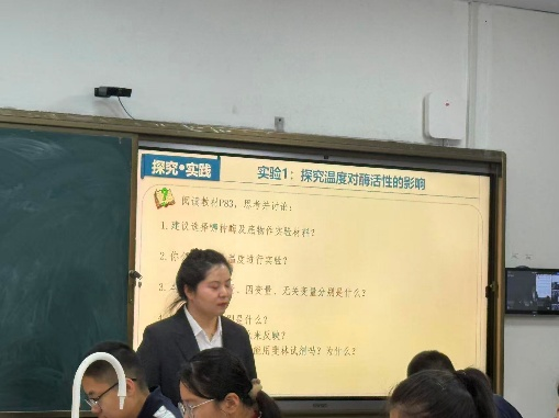 首先,郑宇佳老师以《长安的荔枝》电影片段为趣味导入,紧接着抛出“荔枝为何一日而色变,二日而香变,三日而味变”的核心探究问题,瞬间激发学生的探究欲。课堂上,她引导学生以小组为单位展开讨论、自主设计探究实验,并特意邀请学生走上讲台,借助小卡片直观模拟实验过程,在动手实践与互动展示中逐步推导得出不同实验方案的核心结论。随后,郑老师进一步引导学生将实验结论迁移应用到荔枝保鲜的实际场景中,同时延伸至生产生活的其他相关领域,让学生在解决真实问题的过程中,实现知识的学以致用与灵活迁移。