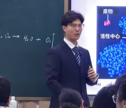 在《酶的作用和本质》一课中,董渊哲老师从“菠萝扎嘴”的生活现象切入,通过过氧化氢分解实验让学生直观感知酶的催化作用,并运用AI动画将“酶降低活化能”的微观机制生动可视化,有效突破教学难点。