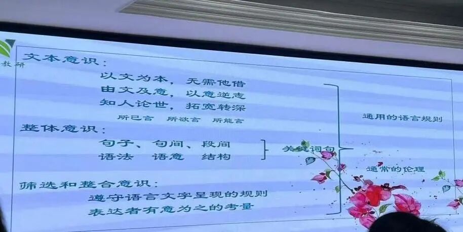在具体操作层面,饶老师重点阐述了命题教师应具备的三种核心意识:文本意识要求坚持“以文为本”,做到“由文及意,以意逆志”,并可适当“知人论世”以拓宽解读深度,她将其精妙概括为关注文本的“所己言、所欲言、所能言”;整体意识需具备从句子、句间、段落到语法、语义、结构的全局把握能力;筛选与整合意识则要求遵循语言文字的内在规则,敏锐捕捉并整合表达者有意为之的关键信息。