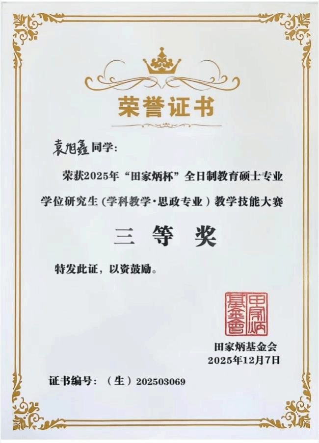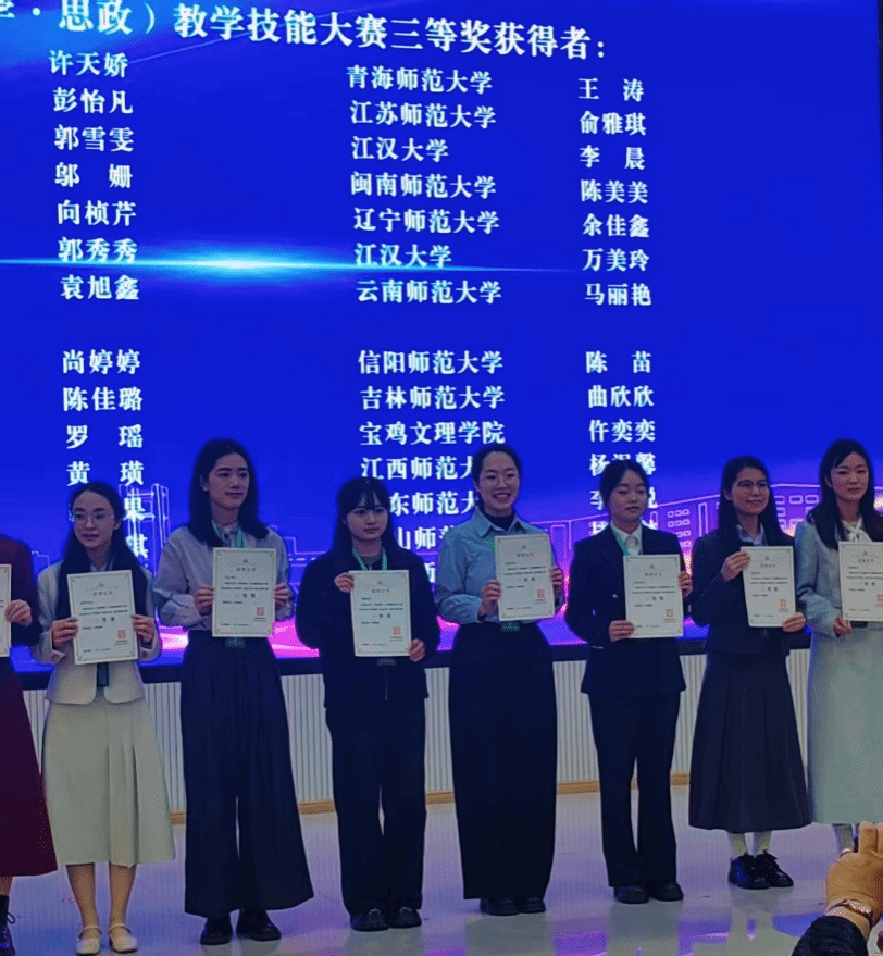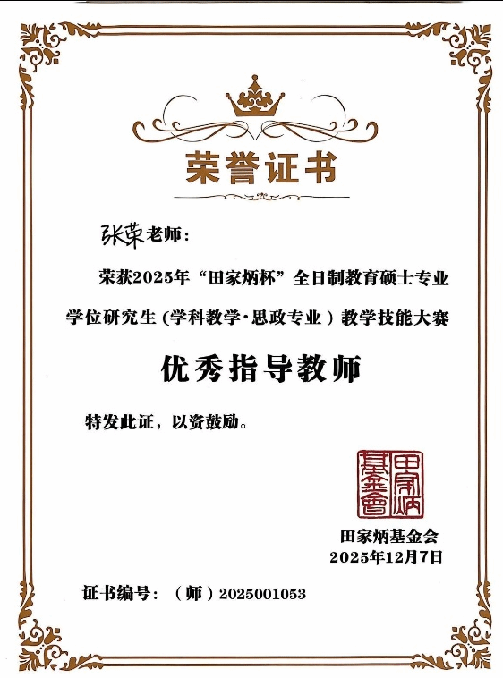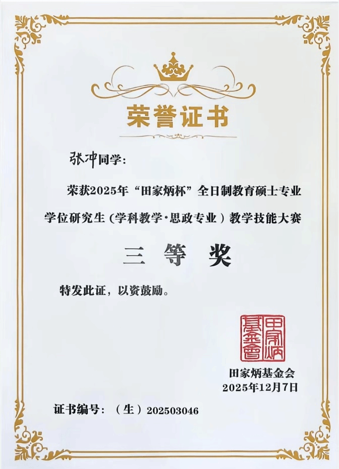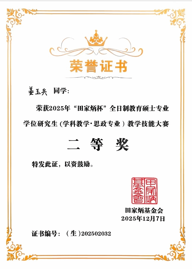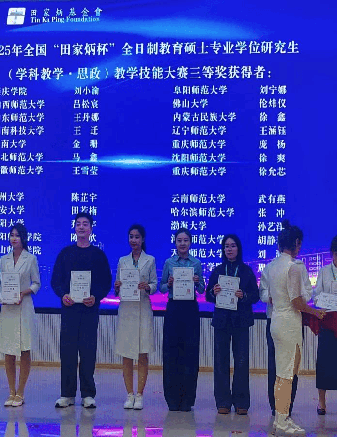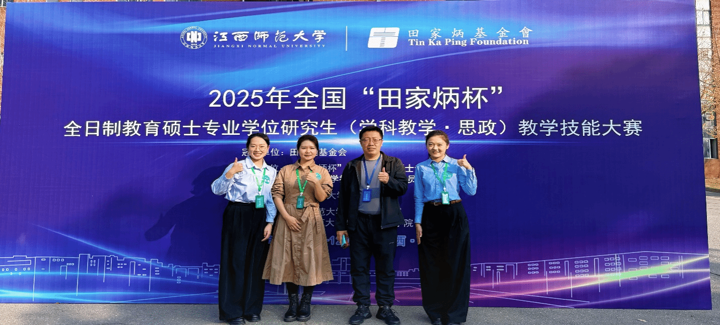 2025年12月6日,全国“田家炳杯”全日制教育硕士专业学位研究生学科教学(思政)专业教学技能大赛决赛在江西师范大学正式落下帷幕。在学科教学(思政)专业白瑞春、张荣、任大顺、高军四位导师的共同指导下。教师教育学院2023级研究生姜玉兵荣获二等奖,袁旭鑫、张冲荣获三等奖。张荣、白瑞春(姜玉兵指导教师)老师荣获优秀指导教师奖。